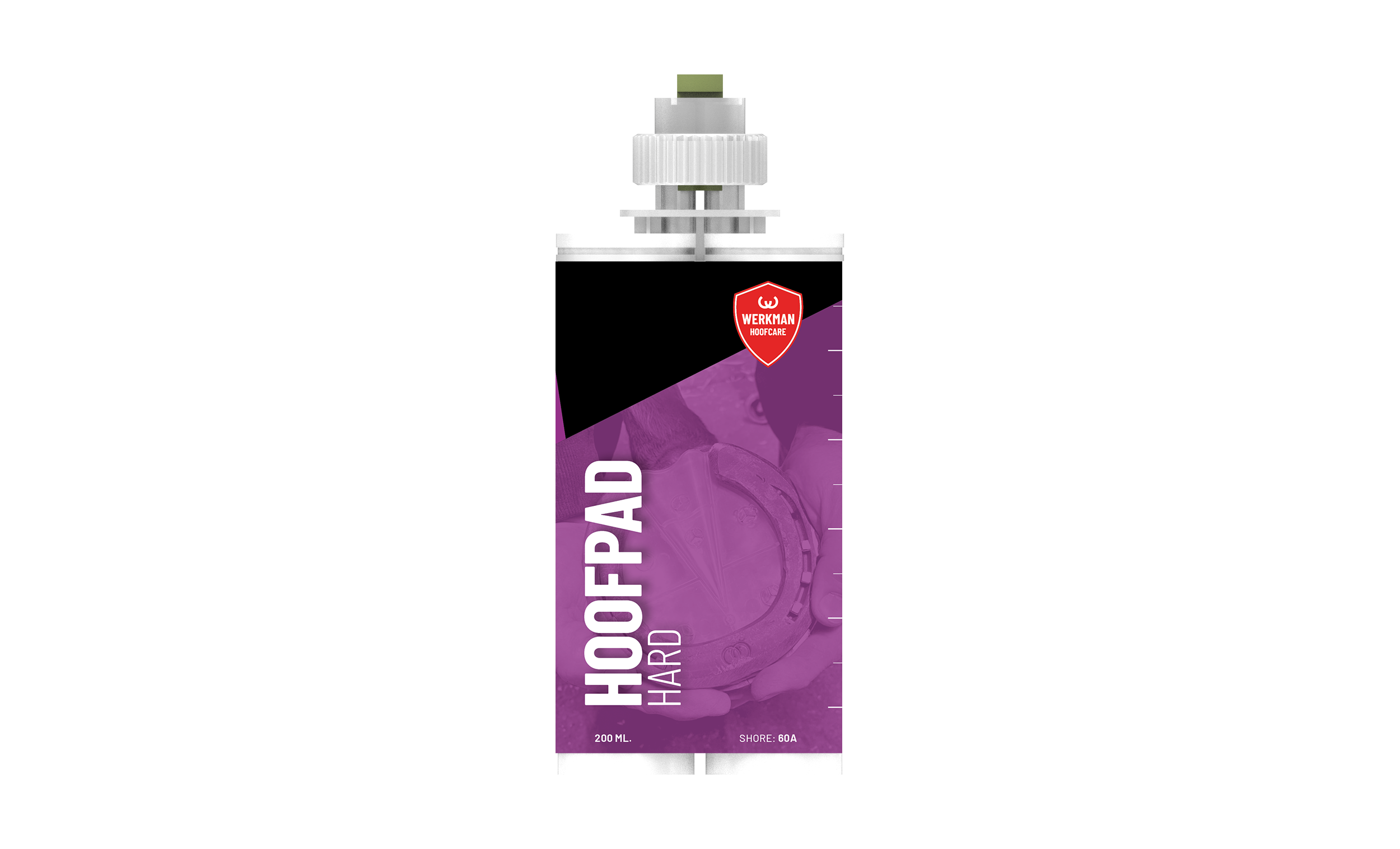 Werkman Hoofpad Hard is a self-adhesive PU-based hoof filler with a Shore hardness of 60A. It can be used without a pad, has a working time of 45 seconds, cures in 3 minutes, and has a shelf life of 12 months from the production date.